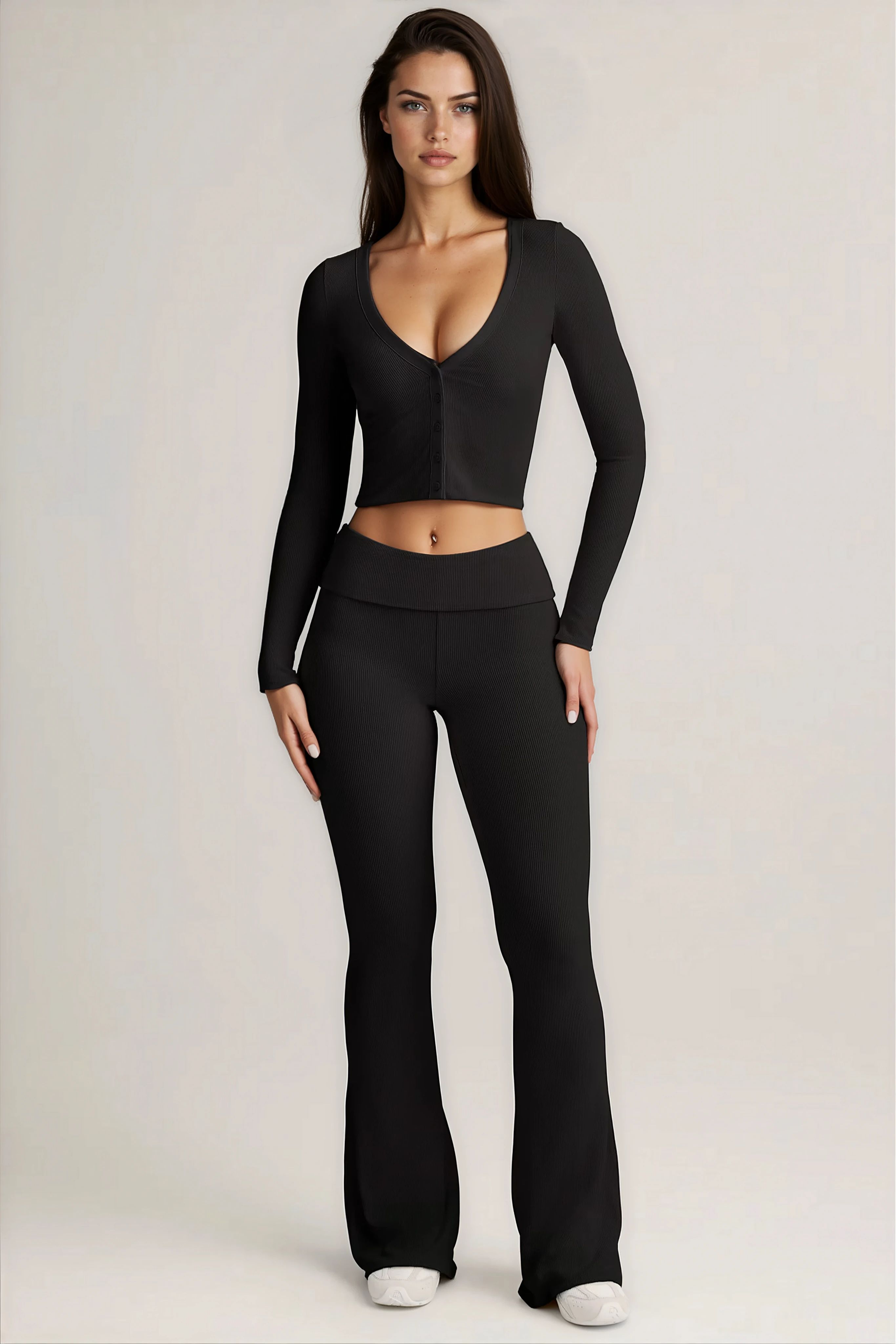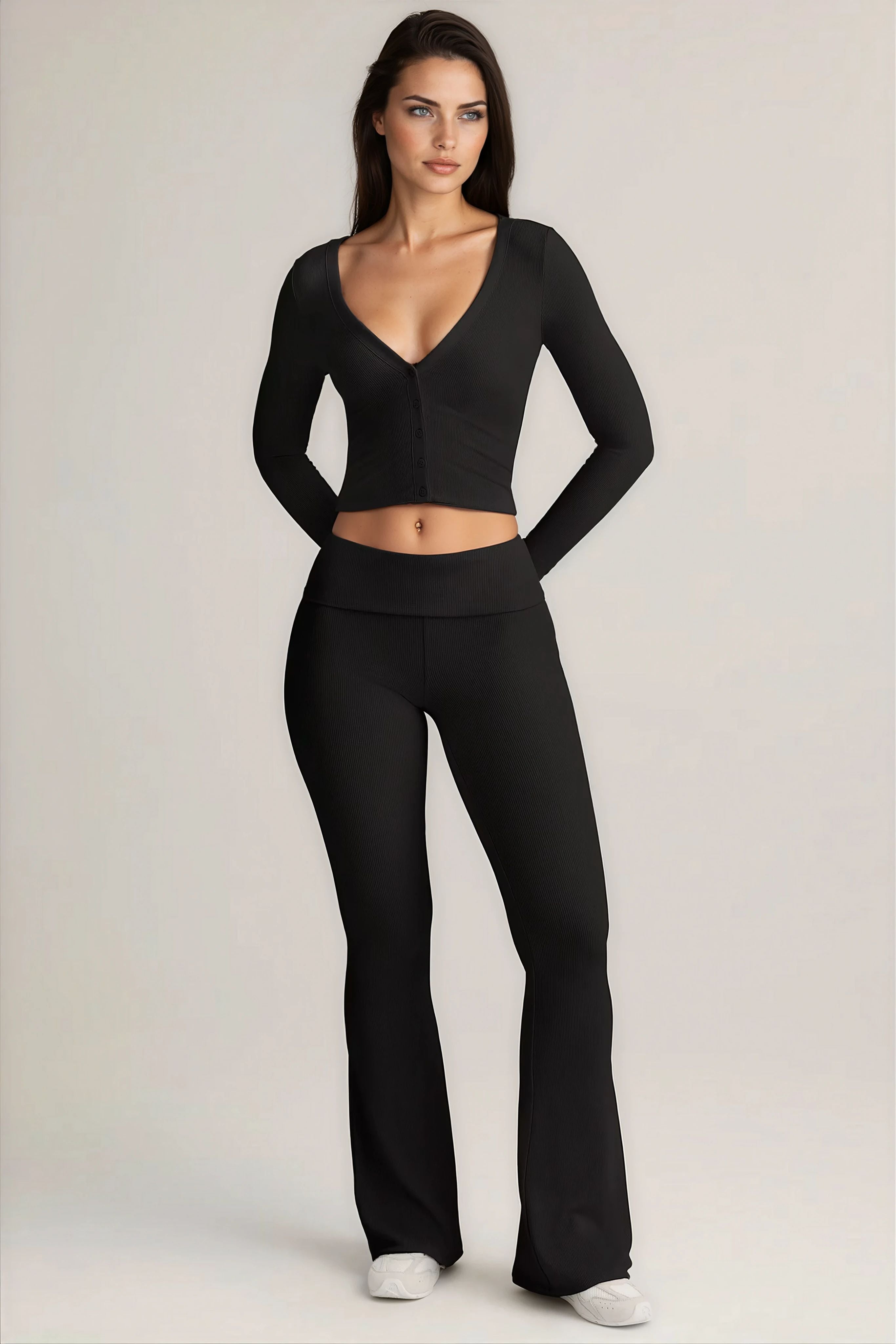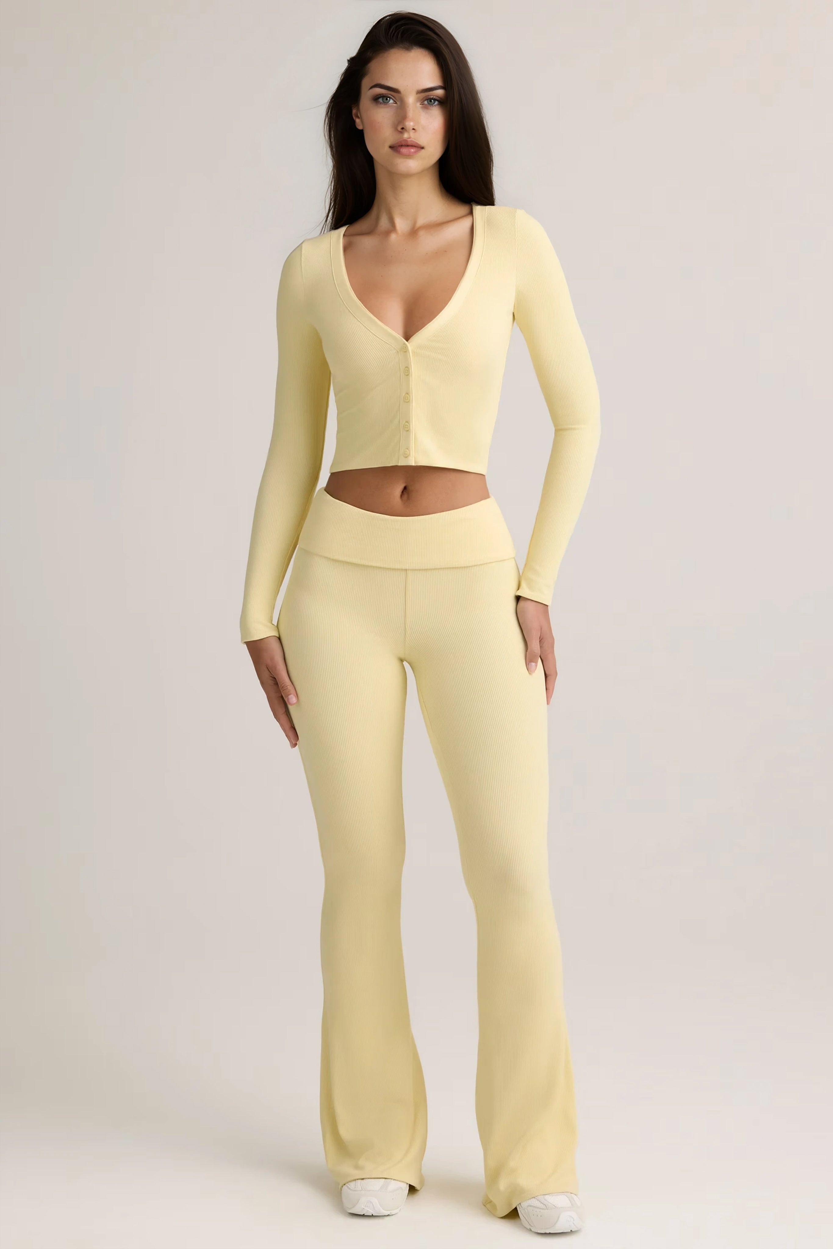 The trousers feature a mid-rise foldover elasticated waistband that adjusts to your ideal fit, while the flared leg adds a timeless silhouette. Paired with the cardigan, cut to a body-hugging fit with a V-neckline, long sleeves, and functional buttons, the set can be styled buttoned-up as a sleek top or left open for a relaxed layered look.