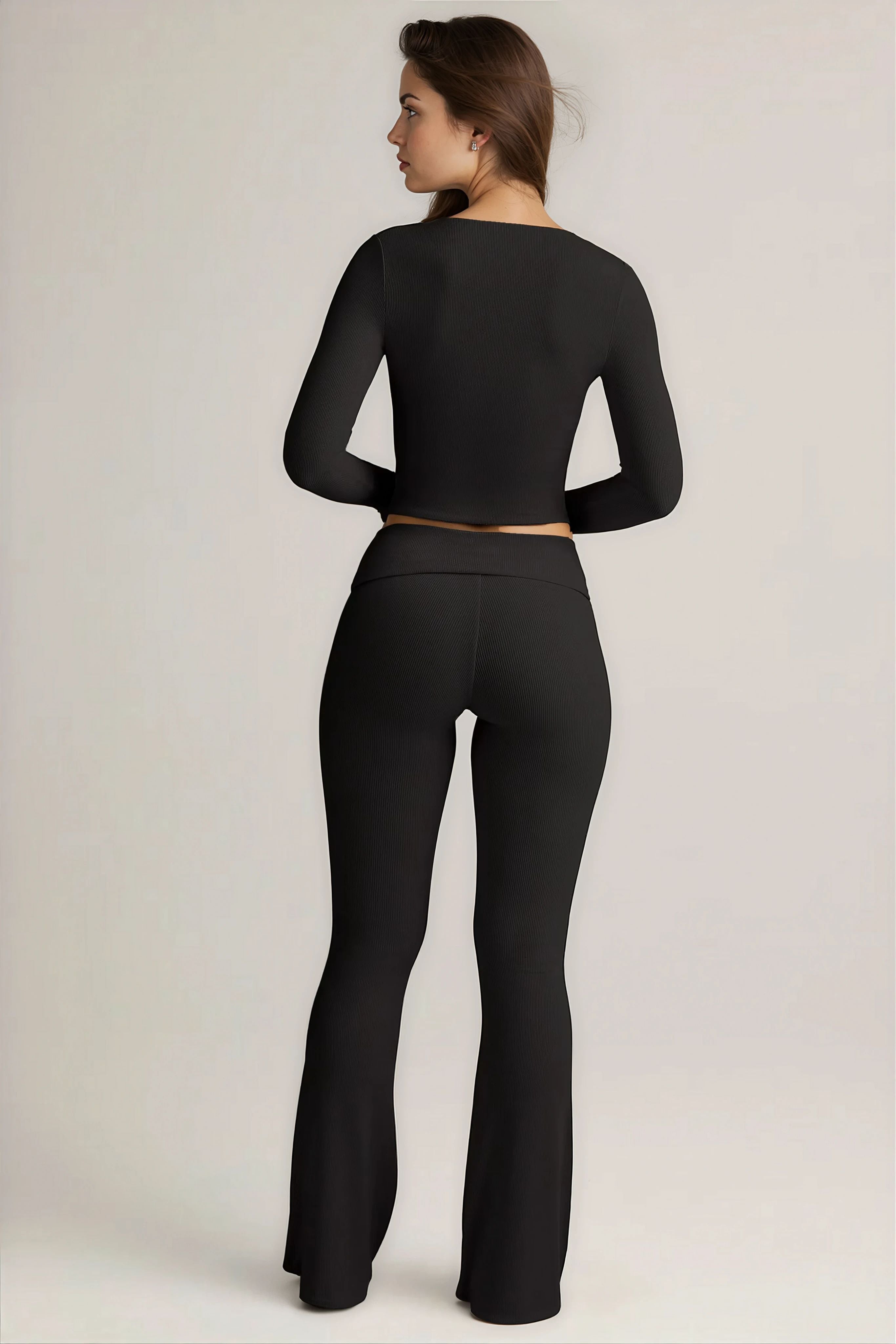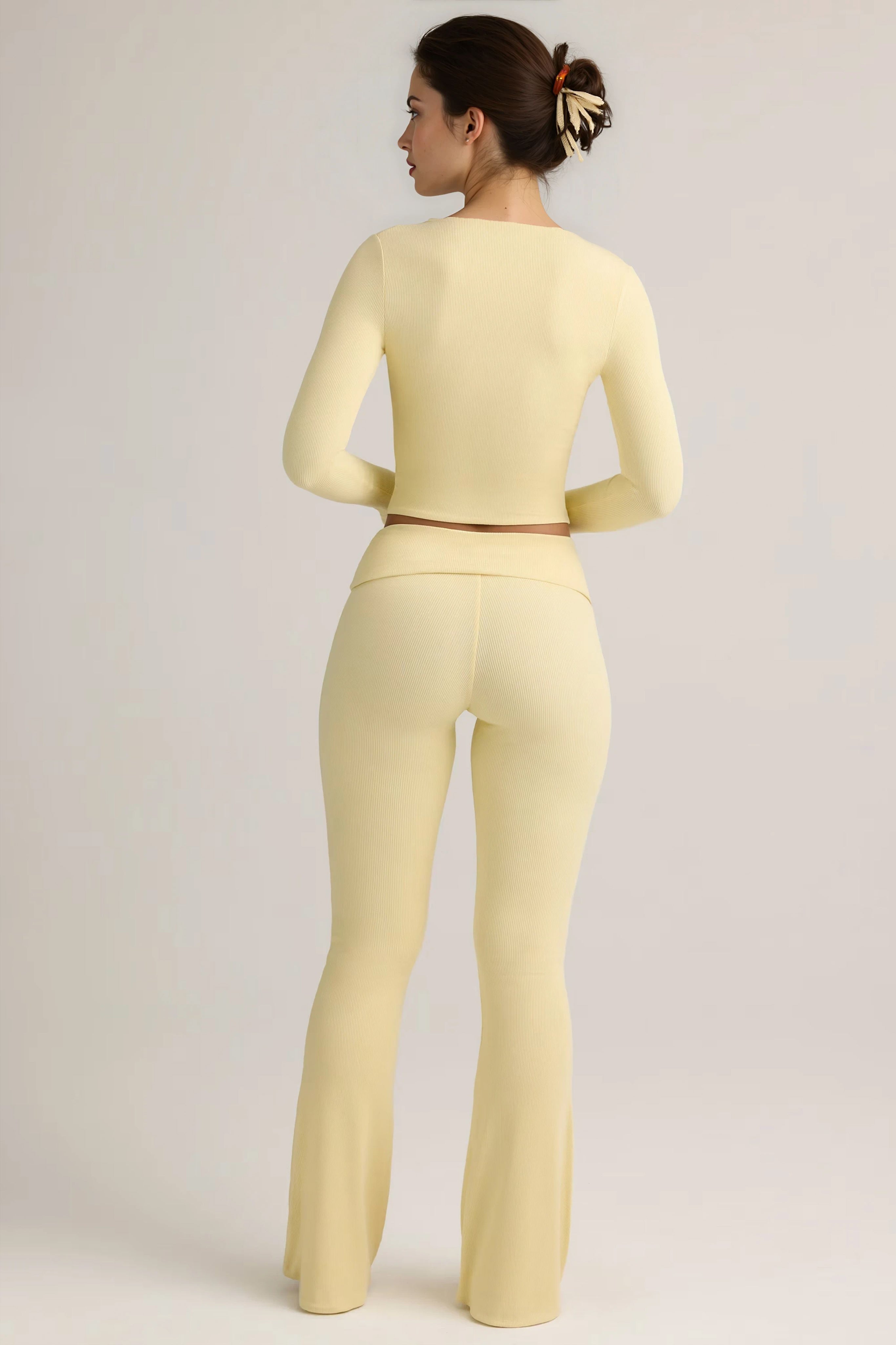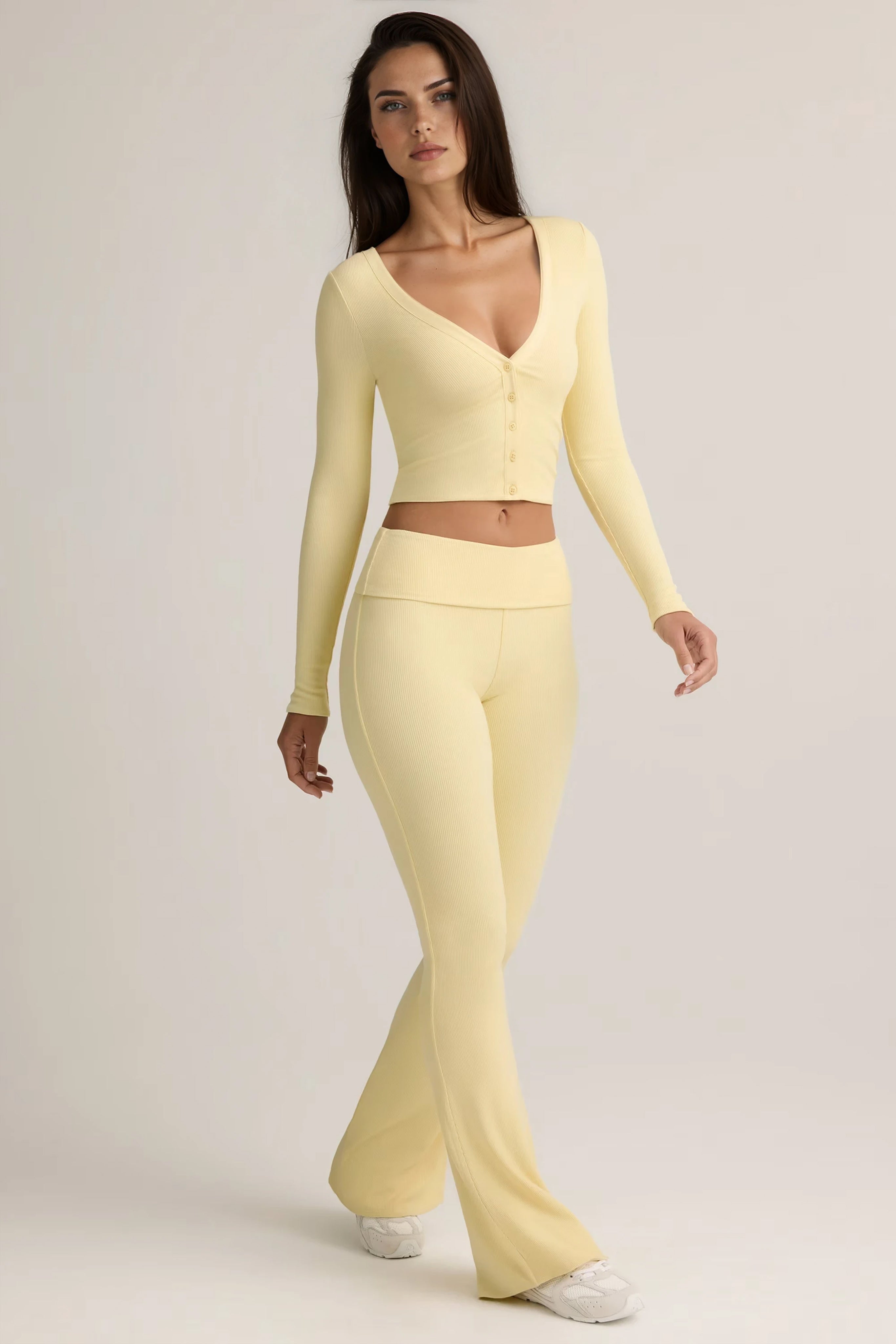 The trousers feature a mid-rise foldover elasticated waistband that adjusts to your ideal fit, while the flared leg adds a timeless silhouette. Paired with the cardigan, cut to a body-hugging fit with a V-neckline, long sleeves, and functional buttons, the set can be styled buttoned-up as a sleek top or left open for a relaxed layered look.