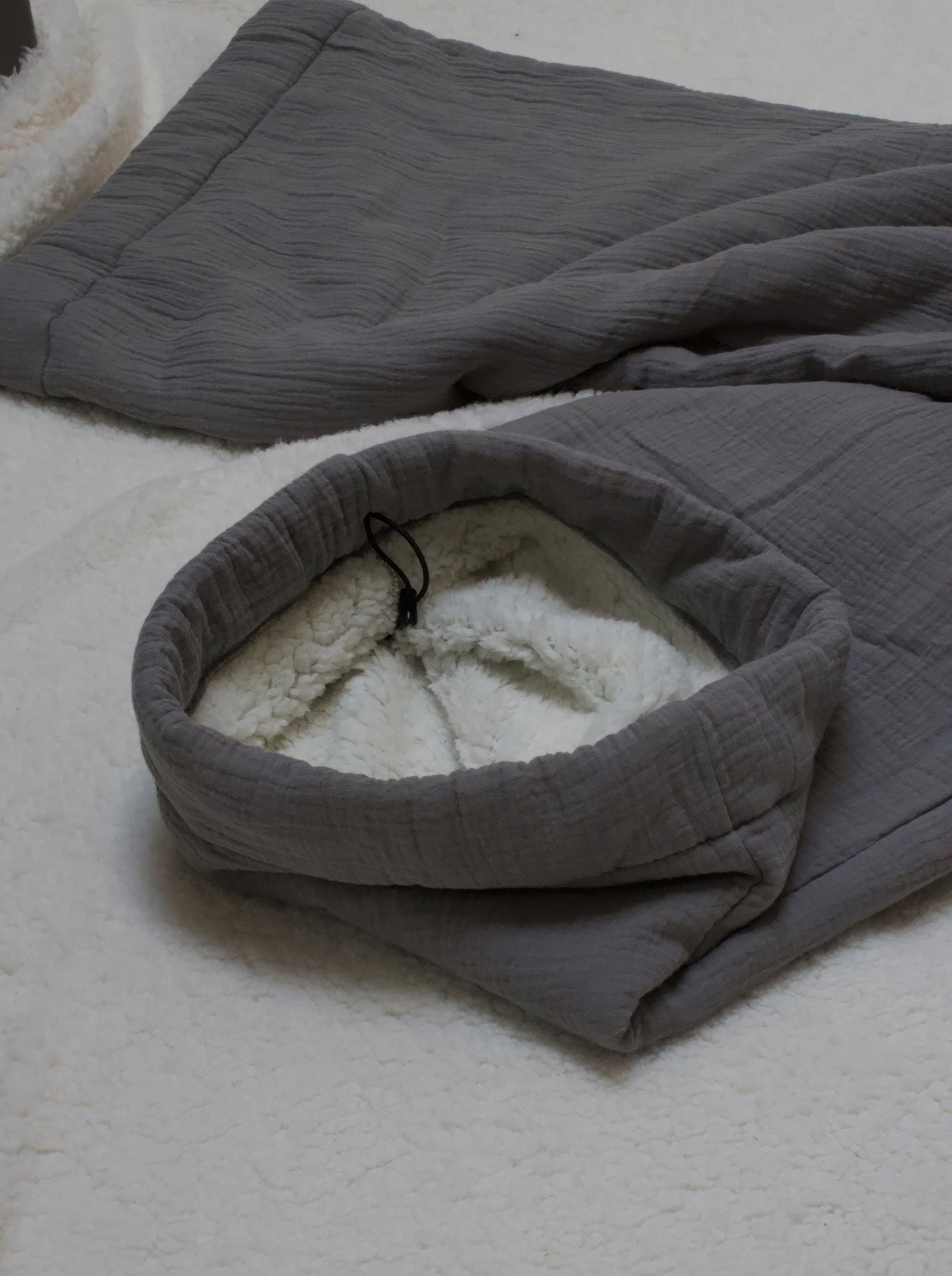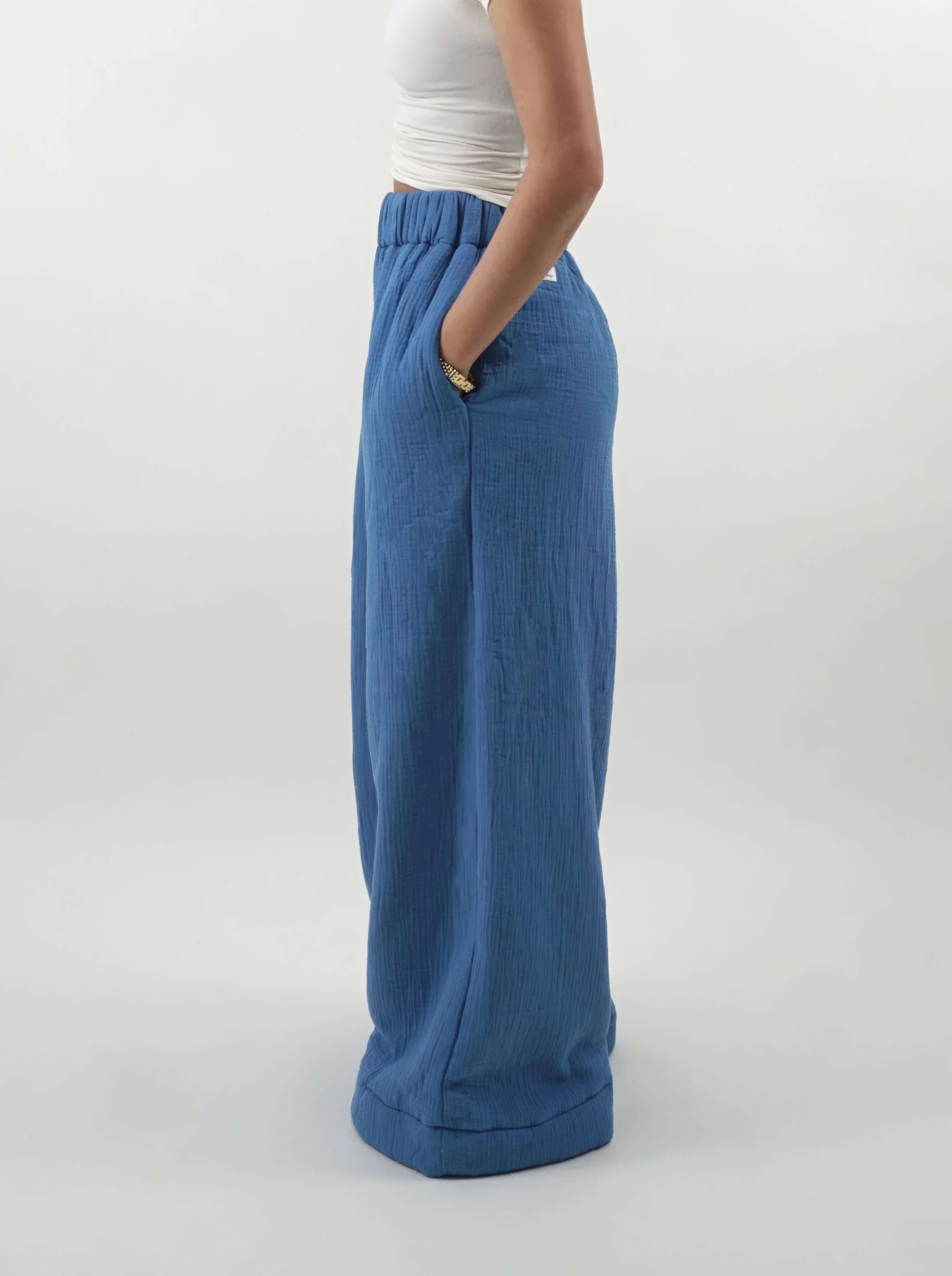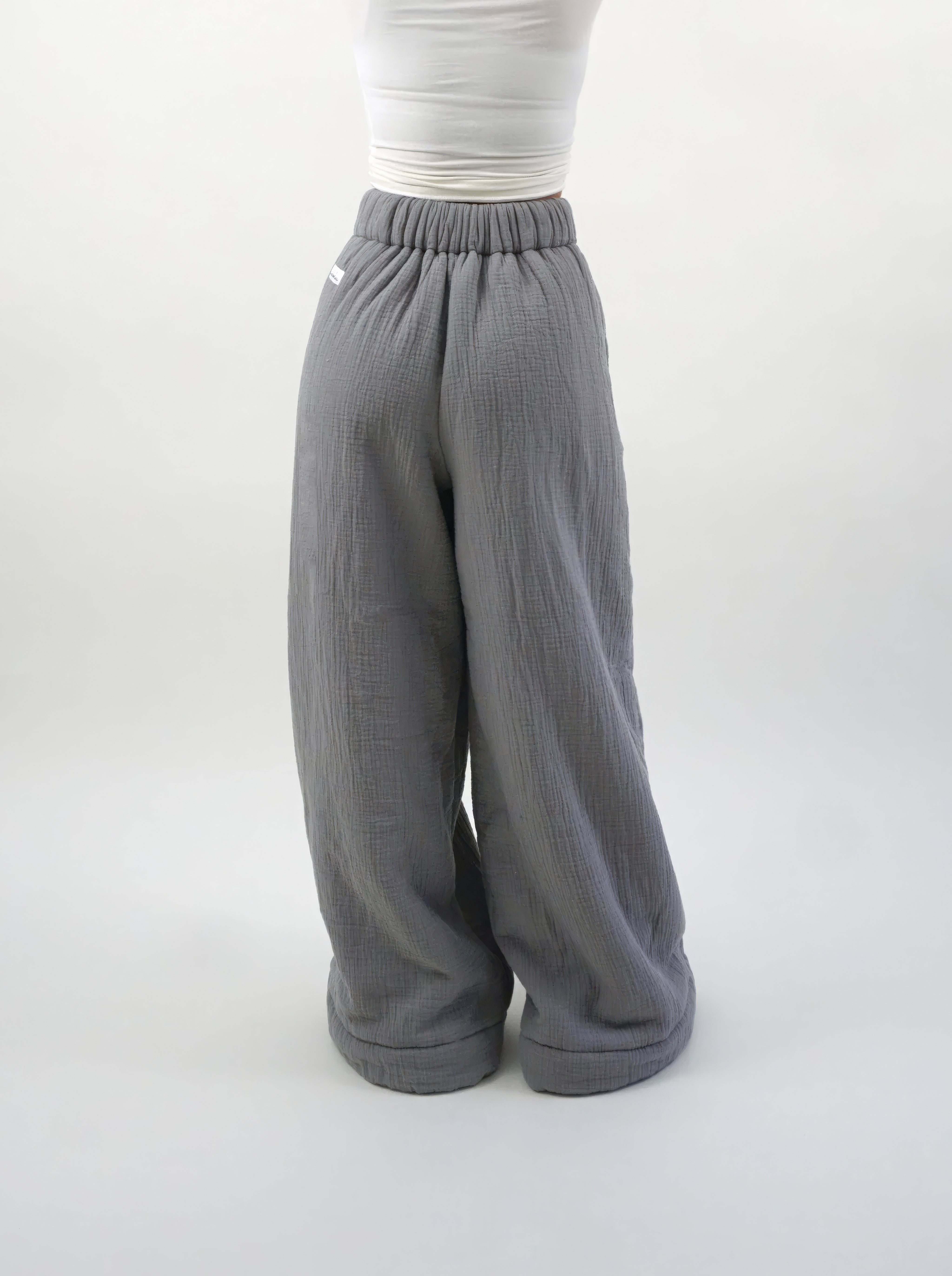 The homebody pants were designed to replicate the feel of wearing a blanket. With a sherpa interior followed by a soft bubble gauze exterior, they are perfect for a night in, catching a movie, getting food, running errands, the list goes on.